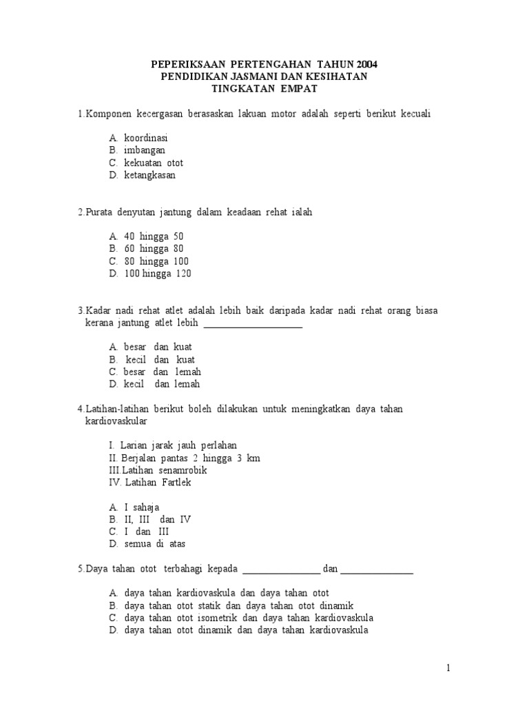 Bahasa Melayu BM Bahasa Inggeris English Matematik Mathematics Sains Science Bahasa Cina Sejarah Teknologi Maklumat dan Komunikasi TMK Reka Bentuk dan Teknologi Pendidikan Islam Pendidikan Moral Pendidikan Jasmani dan Pendidikan Kesihatan Bahasa Arab. Bank soalan pendidikan jasmani tingkatan 4. Add to my workbooks 1 Embed in my website or blog Add to Google Classroom Add to Microsoft Teams.